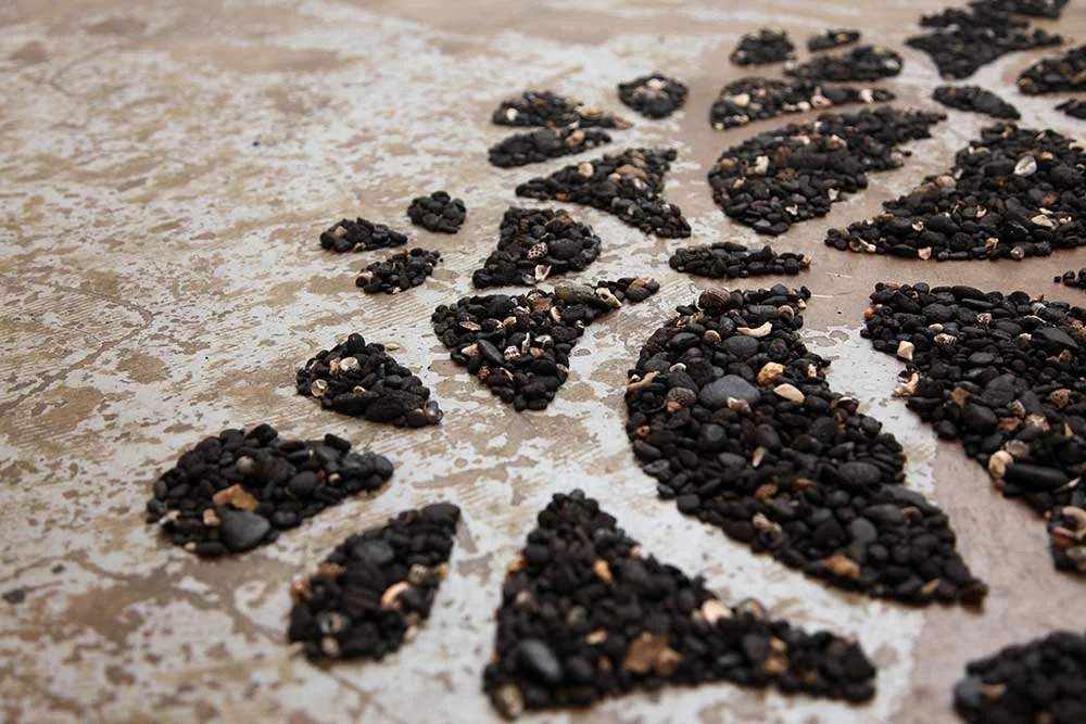 High Tide, New Moon, 7 April 2019, sea-washed coal pebbles & sea ephemera, 1.64 m diameter.